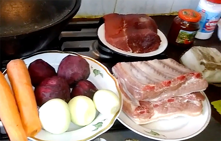 Вода 3л, говядина 350г, картофель 250г, капуста белокочанная 130г, свекла 200г, морковь 100г, лук репчатый 100г, томатная паста 2ст. Л., чеснок 2зубчик, лавровый лист 3шт, растительное масло 2ст.